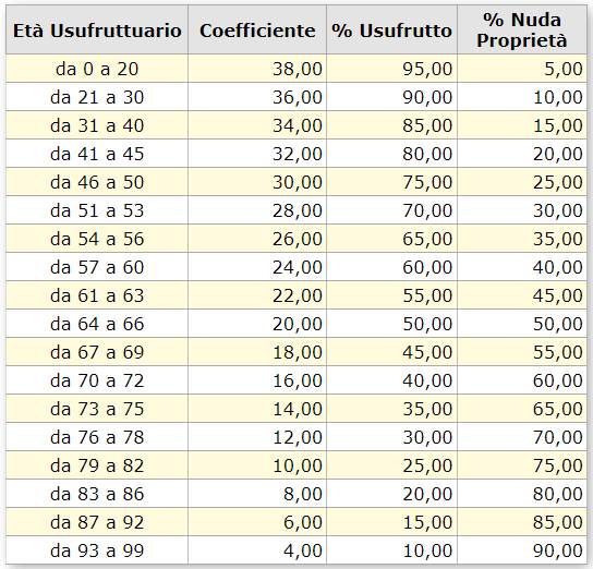 La tabella dei coefficienti che segue quindi non cambia rispetto al precedente anno, sebbene il tasso di interesse legale è sceso al 2% dal 01/01/2025 e serve ad attribuire il valore a un usufrutto o alla corrispondente nuda proprietà (si pensi a una lite divisionale o alla ripartizione del prezzo di una compravendita di un bene sul quale sia impresso un usufrutto). Il pareggio del valore tra usufrutto vitalizio e nuda proprietà si ha, quando l’usufruttuario ha un’età compresa tra 64 e 66 anni: