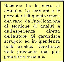 Detto ciò, non mi stupirei di vedere il nostro Mibtel che fino all’autunno balli fra i 28000 ed i 32000 punti, salvo poi essere smentito fra qualche giorno… ma in fondo che importa, metodo e disciplina.